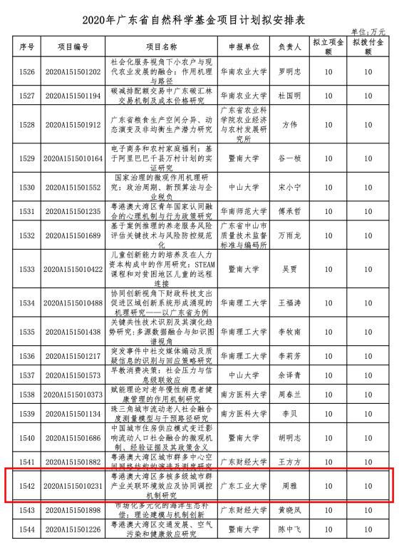 本次获批的项目是通过专家网评和会评,从2019年度申报的广东省自然科学基金项目中,择优遴选出的一批省自然科学基金面上项目、杰出青年项目进入2020年度省科技创新战略专项资金(省基础与应用基础研究基金自然科学基金)项目库,并于2020年按程序进行公示及立项。本次广东省科技厅共资助省自然科学基金项目1643项(杰出青年项目59项,面上项目1584项),拟拨付经费21740万元。我校共获资助杰出青年项目2项、面上项目53项,获批经费达730万元。
