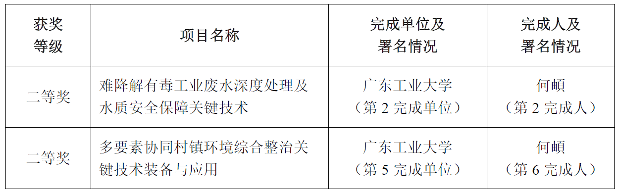 何頔教授与东莞理工学院、中国矿业大学(北京)等共同申报的《难降解有毒工业废水深度处理及水质安全保障关键技术》荣获产学研合作创新成果奖二等奖。此外,何頔教授与中国环境科学研究院、深圳市深港产学研环保工程技术股份有限公司等共同申报的《多要素协同村镇环境综合整治关键技术装备与应用》同时荣获产学研合作创新成果奖二等奖。截至目前,角球比分直播
