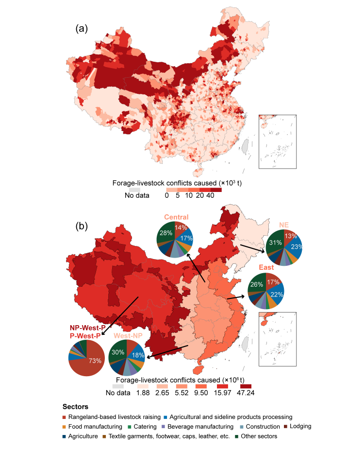 2015年消费侧驱动中国牧区草畜矛盾的空间精细化热点。(a)各个县级单元最终需求驱动2015年中国牧区草畜矛盾。(b)各区域最终需求驱动2015年中国牧区草畜矛盾。图(b)中饼状图显示了由各区域最终需求驱动牧区草畜矛盾的部门结构。
