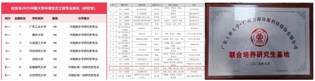 校友会中国大学环境生态工程专业排名A++,蝉联全国第一;软科2025中国大学环境生态工程专业排名全国第八。杜青平教授《生态学》入选国家级一流本科课程;荣获第五届全国高校教学大赛全国二等奖及广东省分赛特等奖、省级优秀教学成果奖。夏琳琳副教授荣获广东工业大学第六届教师教学创新大赛校级一等奖。学院与广州资源环保科技股份有限公司建立研究生联合培养基地。