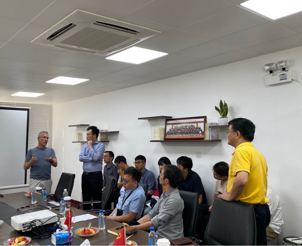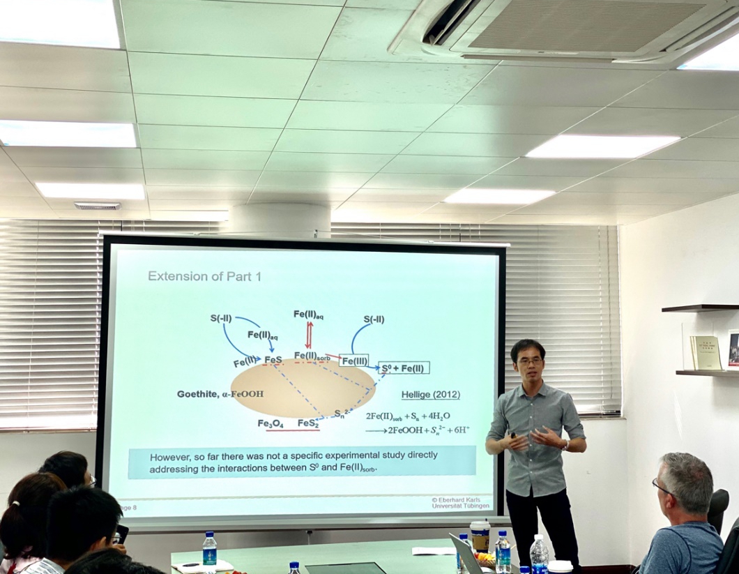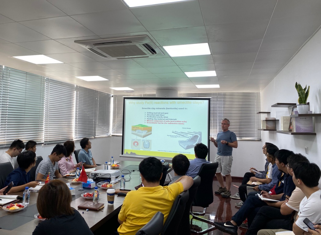 Collins博士首先对澳大利亚新南威士尔大学做了简单介绍,随后介绍了蒙脱石的结构以及其工程应用,指出蒙脱石与亚铁共存,在不同pH条件下可降低铀(U)污染具有显著效果。Collins博士利用EXAFS分析技术揭示了不同环境条件下绿锈(green rust)的形成过程,并提出了在亚铁促进绿绣的生成及其转化中,不仅将溶解性的U(VI)还原为不溶的U(IV),还能在矿物转化过程中将U固定到新生矿物的晶格中,进一步降低铀在环境中的迁移性。最后,Collins博士描述了他们团队新的研究方向,利用铁还原菌还原三价铁矿物产生亚铁,模拟旱季、雨季环境中不同氧气浓度对自然界中反硝化过程的影响。