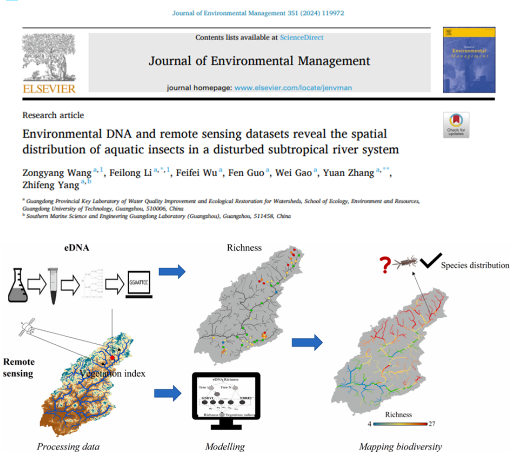 (5) Wang, Z#., Li, F#*., Qin, S., Guo, F., Zhang, Y*., & Yang, Z. (2024) Environmental DNA and remote sensing datasets reveal the spatial distribution of aquatic insects in a disturbed subtropical river system. Journal of Environmental Management, 351, 119972.