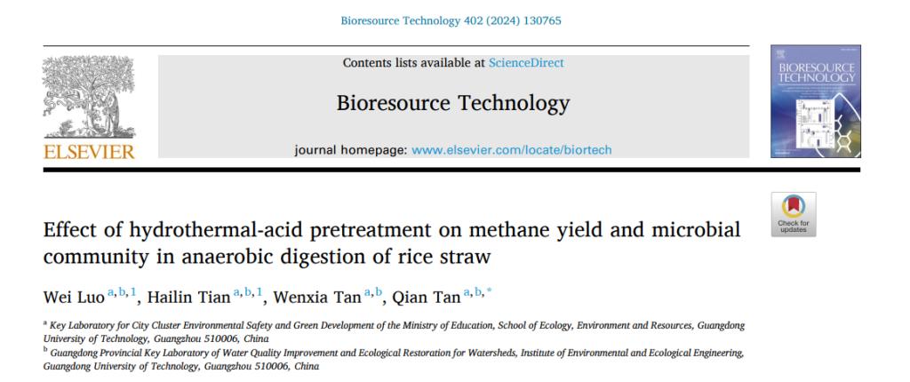 角球比分直播 谭倩教授课题组研究成果“Effect of hydrothermal-acid pretreatment on methane yield and microbial community in anaerobic digestion of rice straw”在中科院1区TOP期刊Bioresource Technology上发表。谭倩教授为论文通讯作者,硕士研究生罗威与田海林教授为论文共同第一作者。