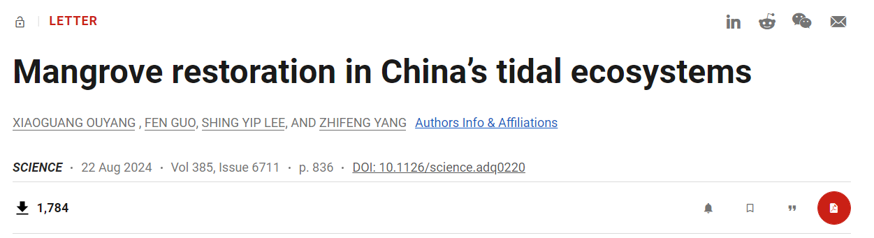 论文全文:Ouyang,X.,Guo, F., Lee,S.Y, Yang, Z. (2024) Mangrove restoration in China’s tidal ecosystems. Science, doi:10.1126/science.adq0220.