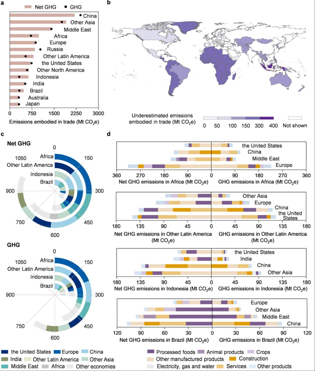 为填补上述空白,本研究综合考虑了受人为活动影响的温室气体排放源和去除汇,构建了全球各国温室气体净排放数据集,并量化了各国最终需求驱动的全球温室气体净排放量以及国际贸易中隐含的净排放。相比于仅关注温室气体排放源,本研究识别了更多需要关注的关键国家、消费产品和贸易关系。研究结果可为实现净零排放提供新见解,更有助于实现《巴黎协定》的温控目标。