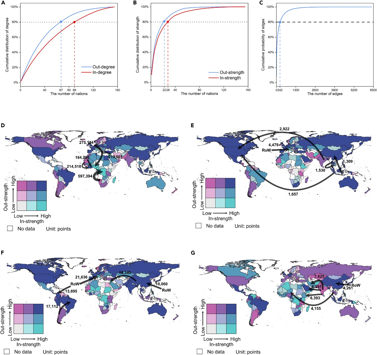 图2 隐含甲基汞相关健康风险网络特征(a-c)及不同食品贸易中风险转移的关键国家和贸易流(d-g)