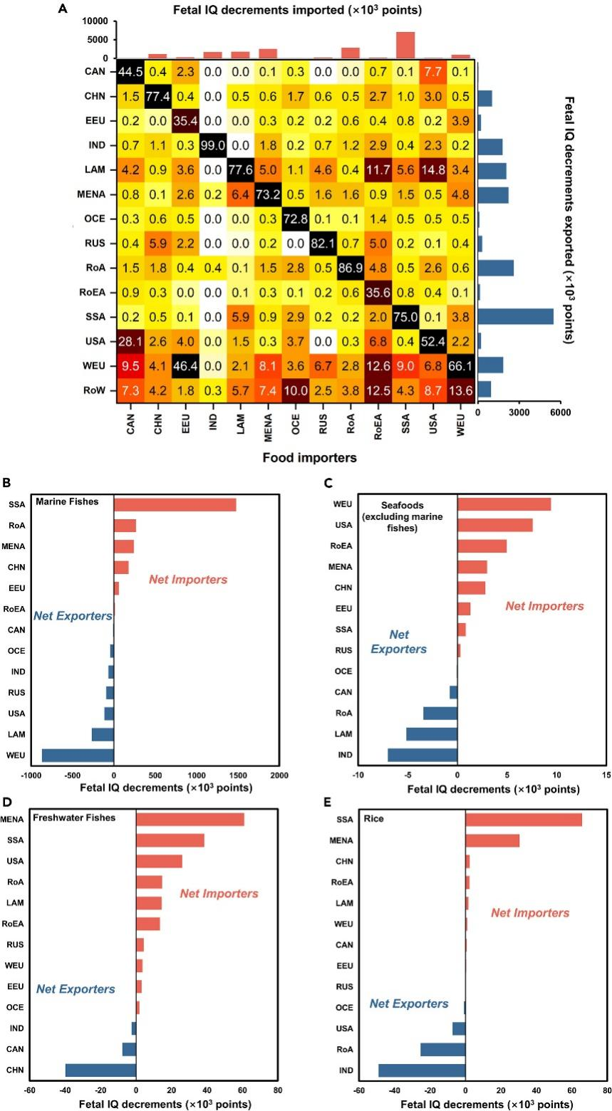 2018年全球膳食甲基汞暴露导致了1.9×107点胎儿智商下降,其中38%(7.3×106点)与食品贸易相关。在加拿大和东欧等地区,超过一半的胎儿智商下降与进口食品相关;在中国、印度和拉丁美洲等地区,这一比例不到三分之一。不同食品贸易中的甲基汞相关健康风险呈现出显著的区域差异。在海鱼贸易中,发达地区(如西欧和美国)通常是风险的净出口者,而海鱼的新兴消费市场(如撒哈拉以南非洲和中国)为净进口者。相反,在淡水鱼和其他海鲜贸易中,发达地区是风险的净进口者,发展中地区成为净出口者。在大米贸易中,主要生产国(如印度和美国)是风险的净出口者,中国作为全球最大的大米生产国,因庞大的国内需求,仍需进口大量大米以满足消费需求,因此成为风险的净进口者。
