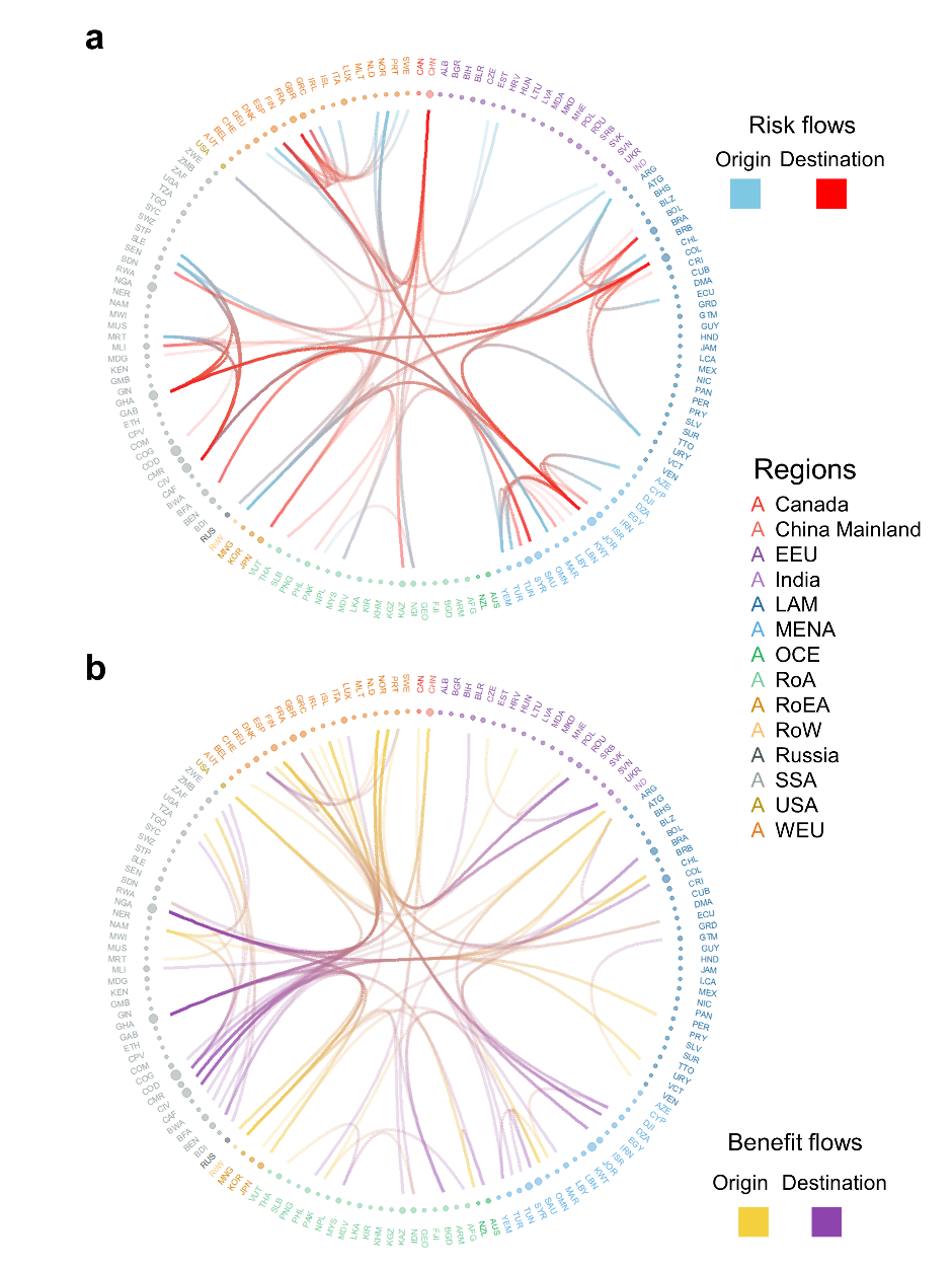 图1.区域间甲基汞相关健康风险的源汇关系(a)以及不同食品贸易中区域风险的净流动模式(b-e)