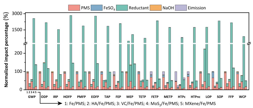 图4:各种类芬顿系统的归一化环境影响及贡献分析。