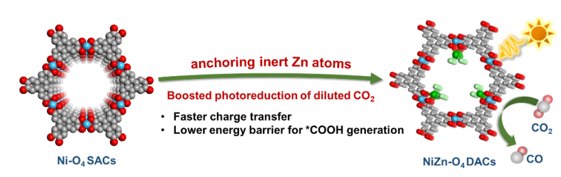 利用太阳能将二氧化碳(CO2),尤其是人为源的低浓度CO2直接转化为高附加值化学品(如CO),是应对能源和气候危机的理想方案。然而,C=O键的高解离能、受限的光生电荷分离效率,以及在低CO2浓度下其他组分的竞争吸附,导致CO2难以在催化剂表面吸附和活化,限制了反应的活性和选择性。研究团队成功构建了一种基于导电金属有机框架(CMOF)的镍-锌双原子催化剂(NiZn-O4DACs),该催化剂利用惰性Zn位点与活性Ni位点的协同作用,实现了高效、高选择性光催化还原人为源低浓度CO2。当Ni/Zn比例为4:1时,NiZn-O4DACs在纯CO2气氛中实现了20.17 μmol h-1的CO生成速率,选择性达到97%,优于镍单原子催化剂(Ni-O4SACs)以及大多数已报道的体系。此外,在人为源低浓度CO2(10%)中,NiZn-O4DACs的CO选择性仍能保持在94%,而Ni-O4SACs的CO选择性则明显下降(从95%降至88%)。光电化学测试表明,Zn位点的引入促进了光生电子-空穴对的分离和迁移,提高了电荷分离与传输效率。理论计算结果进一步揭示,通过引入惰性的Zn位点,有效调节了邻近Ni活性中心的电子结构,加速了电子转移,提升了还原动力学,显著降低了形成关键中间体*COOH所需的能垒。这项工作深入阐明了DACs中惰性金属位点与活性位点之间的协同作用机制,为开发适用于特定应用场景的高效DACs提供了理论依据与参考。