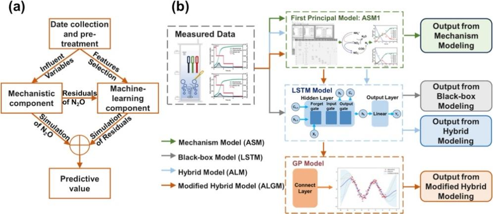 污水处理厂中一氧化二氮(N2O)排放的机理模型通常存在参数过度化的问题,而机器学习方法缺乏可解释性。为了解决这些局限性,本研究构建了一种融合活性污泥机理模型、长短期记忆网络(LSTM)与高斯过程(GP)回归的可解释混合建模框架。研究采用串并联架构,首次将GP应用于N2O预测建模,并通过贝叶斯估计方法实现了有限数据集下模型不确定性的有效量化。研究结果表明,该混合模型在预测系统总N2O排放量时表现出良好的准确性(R2>0.99),其平均绝对误差较LSTM模型和基于LSTM的混合模型分别降低了66.4%和47.8%。此外,SHAP分析结果显示,曝气通量是控制N2O排放的关键影响因素(贡献度>0.4)。本研究将底层机理知识与数据驱动的不确定性分析相结合,使模型在多种运行工况下均展现出良好的泛化能力,为污水处理行业实现兼具可解释性与不确定性评估的温室气体减排提供了客观的方法学参考。