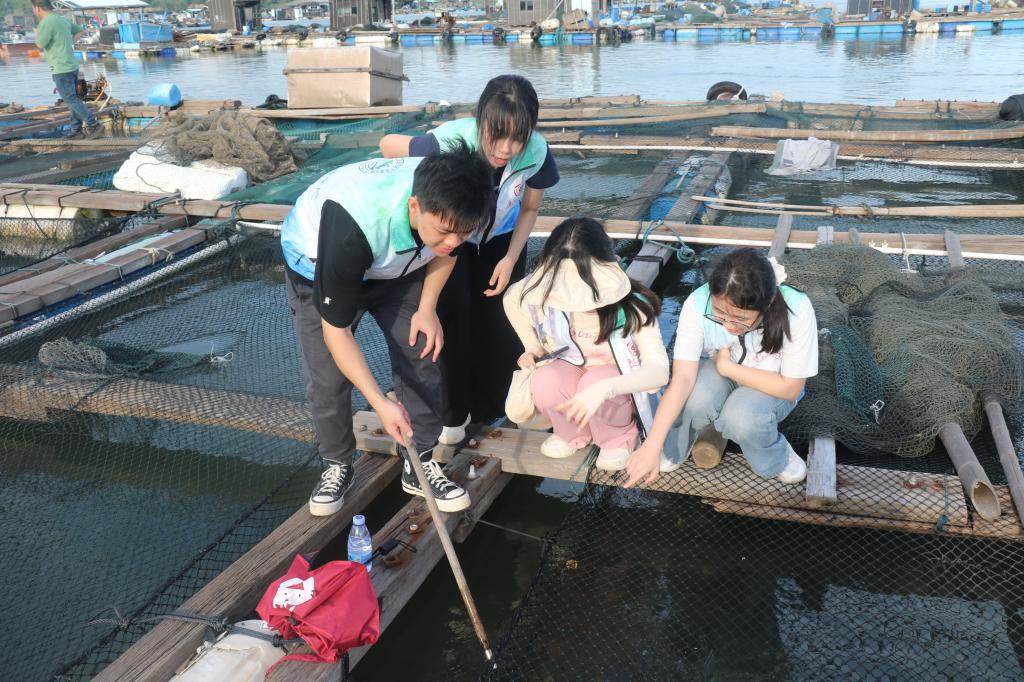 栏水追浪风帆起,耕海兴渔看今朝。为深入推进“百千万工程”,在当地海洋牧场负责人的带领下,突击队登上鱼排切实了解当地海洋牧场特点。鱼排上的悬吊式养殖可以充分利用水域空间,无设置水底支撑结构,可以灵活结合循环水处理技术、生态养殖技术等,实现养殖过程的精准控制和高效管理。海洋牧场系统化繁育由活体原生生物和浮游藻组成的纯天然饵料,保证了饵料新鲜程度和健康程度。“关心海洋、认识海洋、经略海洋”是我国向海图强的实践诉求。在海洋牧场调研学习,突击队对海洋水产养殖工作有了更深刻的认识,为实践队队员们日后的学习与研究方向点明了思路。