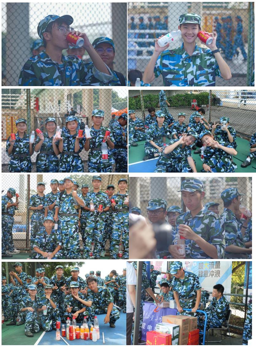 同学们畅饮着学院精心准备的王老吉、维他命等解暑品,以缓解在高温下训练的疲惫与不适,他们表示深受鼓舞,感受到来自学院的温暖与关怀,坚定了高质量完成军训的信心.