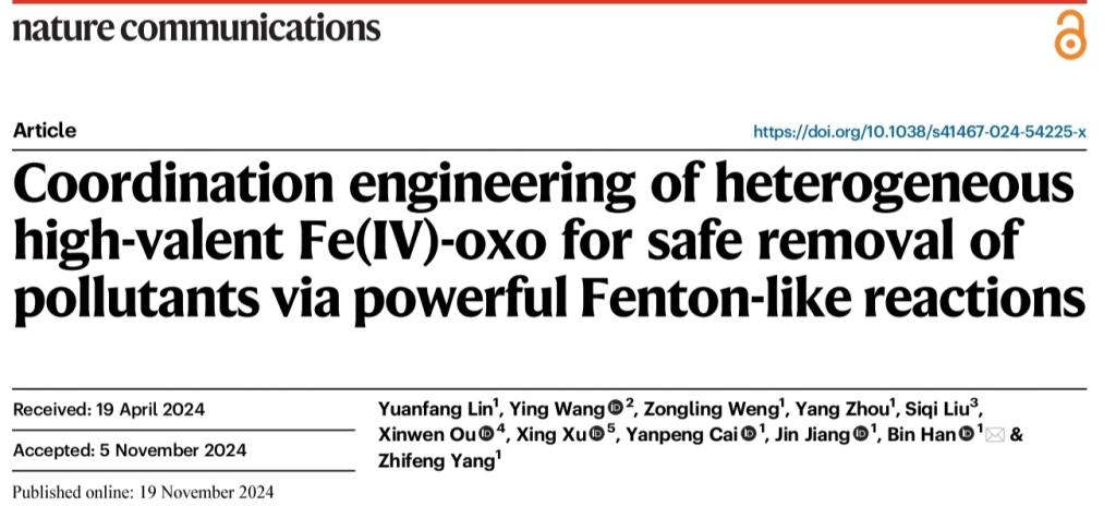 杨志峰院士团队韩彬教授课题组在Nature Communications上发表了“Coordination engineering of heterogeneous high-valent Fe(IV)-oxo for safe removal of pollutants via powerful Fenton-like reactions”的研究论文。韩彬教授为论文通讯作者,角球比分直播