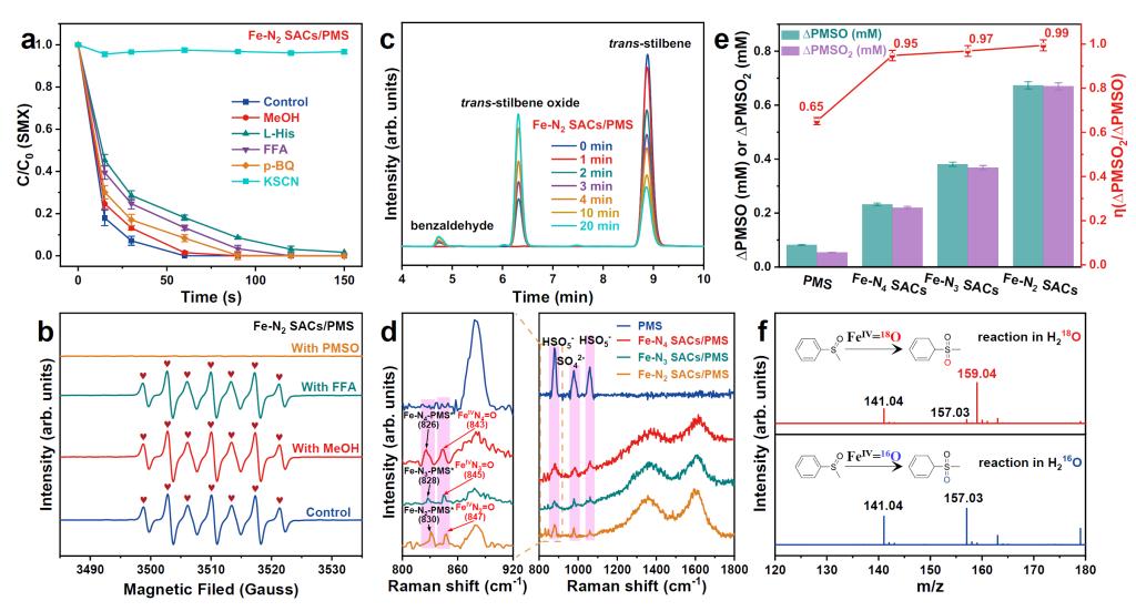图3. (a) 在不同牺牲剂存在下的SMX降解性能。(b)Fe-N2 SACs/PMS体系中不同条件下的5,5-dimethyl-1-N-oxyl (DMPOX)的EPR信号。(c)在Fe-N2 SACs/PMS中trans-stilbene的氧化。(d)Fe-N2 SACs/PMS的原位拉曼光谱。(e)PMSO的消耗和PMSO2产生以及计算的η(PMSO2)值。(f)在18O标记以及未标记的Fe-N2 SACs/PMS体系中PMSO和产生的PMSO2的质谱图。