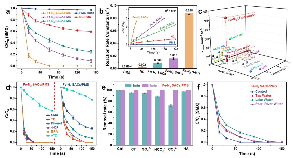 图2. (a-b) Fe-Nx SACs体系的SMX去除效率以及对应的反应速率常数。(c)不同基于PMS的类芬顿体系中不同催化剂的kvalue。(d)Fe-N2和Fe-N4 SACs对不同污染物的氧化活性。(e)Fe-N2/PMS体系在不同离子和NOM存在条件下1 min和4 min的SMX去除比例。(f)Fe-N2/PMS体系在不同实际废水中的SMX去除效率。