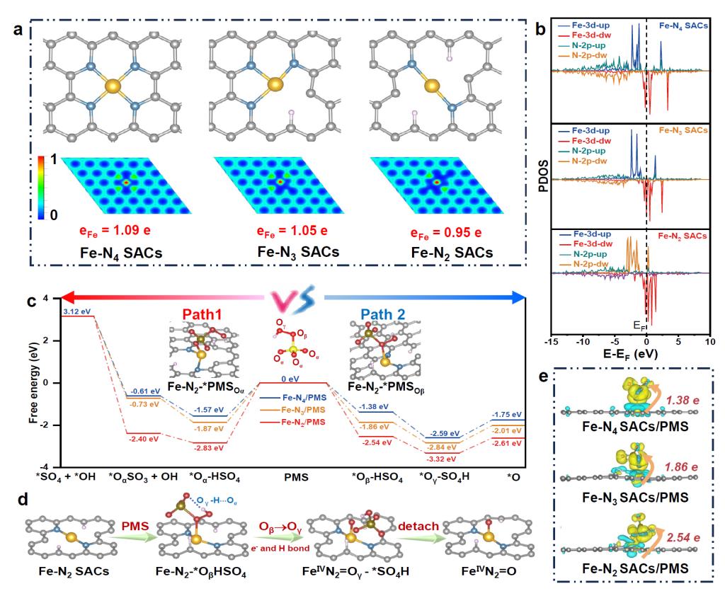 图4.(a)Fe-Nx SACs的结构模型以及二维电子密度分布图像。(b)Fe-Nx SACs中Fe原子和N原子的PDOS。(c)在不同吸附位点上的可能反应路径的自由能。(d)Fe-N2 SACs上的PMS的反应路径。(e)PMS吸附后Fe-Nx位点的差分电荷密度。