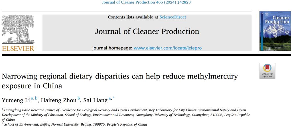 论文速递 | 梁赛教授课题组在Journal of Cleaner Production发表最新成果:缩小区域膳食差异有助于减少中国人群甲基汞暴露