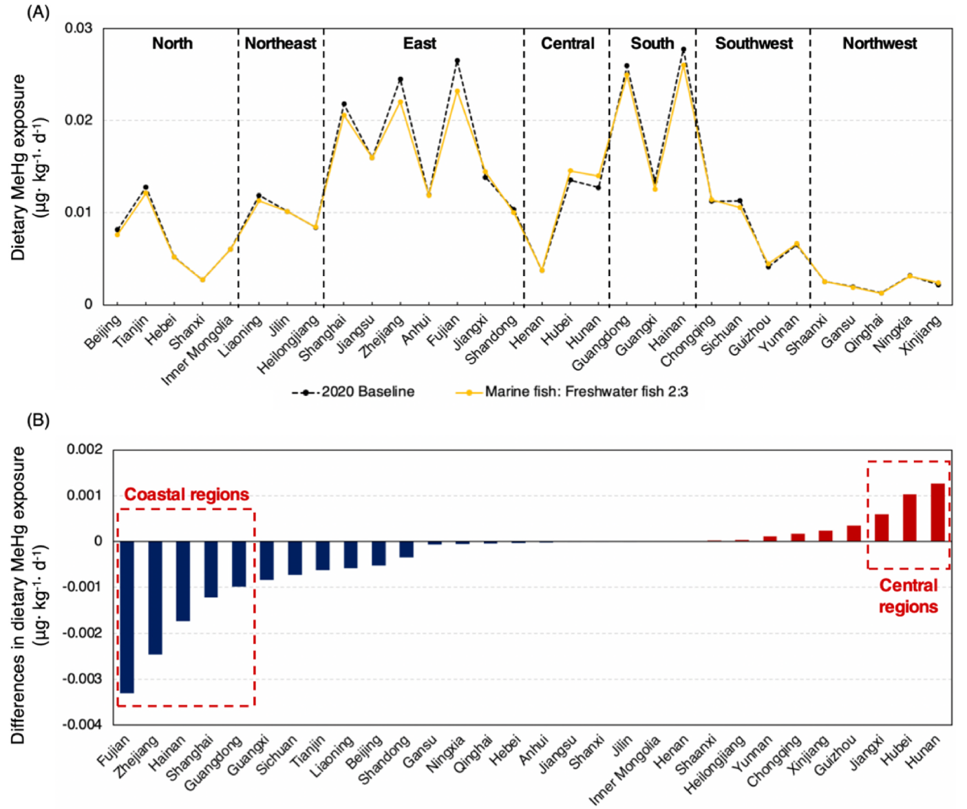 图5. 膳食行为优化效益分析(图A展示了2020年中国各省的实际膳食甲基汞摄入量以及海鱼与淡水鱼摄入比例为2:3时的甲基汞摄入量;图B为缩小地区膳食差异(即各省均采取2:3的摄入比例)后各省膳食甲基汞暴露量与2020年基准值的差异)