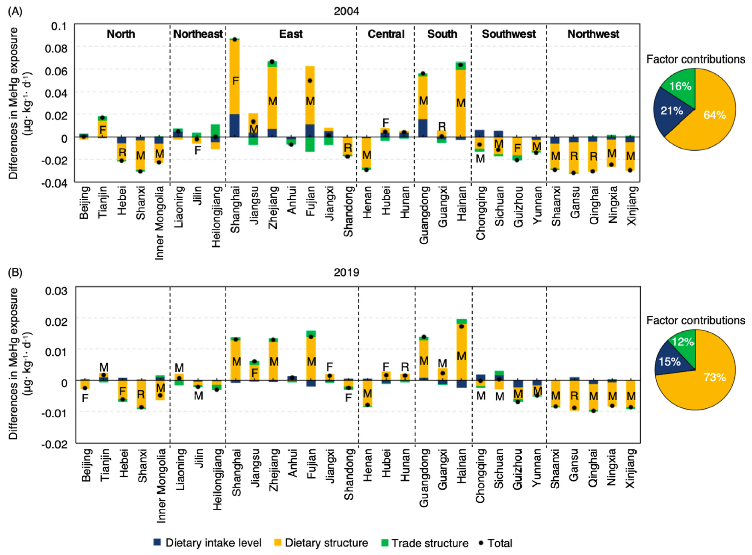 3.中国各省与全国平均水平之间膳食甲基汞摄入量差异的影响因素(柱状图上的字母表示导致这种差异的主要食物类别,“M”、“F”和“R”分别代表海鱼、淡水鱼和大米)