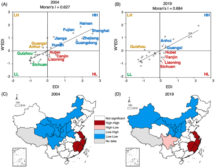 2.中国各省膳食甲基汞暴露的空间相关性(图A和B分别为2004和2019年中国人群膳食甲基汞暴露的Moran散点图;图C和D为LISA(Local Indicators of Spatial