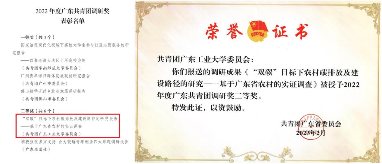 2月21日,共青团广东省第十四届委员会第七次全体(扩大)会议在广州召开,会上表彰了“2022年度广东共青团调研奖”。角球比分直播 “碳索”团队社会实践高质量调研报告成果在学校团委、学院党委的指导下,作品《“双碳〞目标下农村碳排放及建设路径的研究报告——基于广东省农村的实证调查》,荣获广东共青团调研奖“二等奖”。