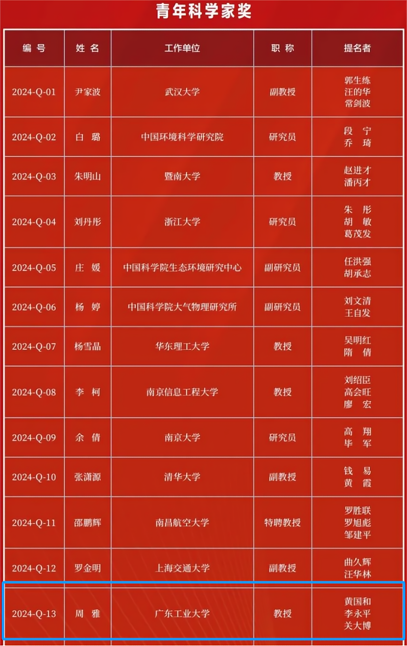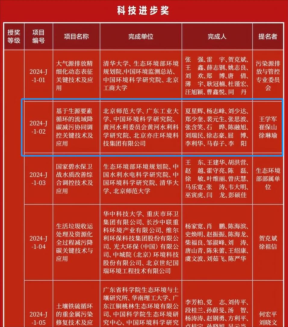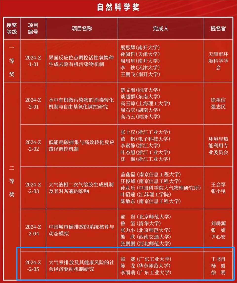 12月31日,2024年度环境保护科学技术奖奖励名单公布,其中角球比分直播 杨志峰院士、徐志豪教授、张思波副教授参与的《基于生源要素循环的流域降碳减污协同调控关键技术及应用》项目获科技进步奖一等奖;梁赛教授牵头、李雨萌博士参与的《大气汞排放及其健康风险的社会经济驱动机制研究》项目获自然科学奖二等奖;马金星教授参与的《混合ROS定向调控和氧化工艺强化净水关键技术与应用》项目获技术发明奖二等奖;周雅教授获青年科学家奖!