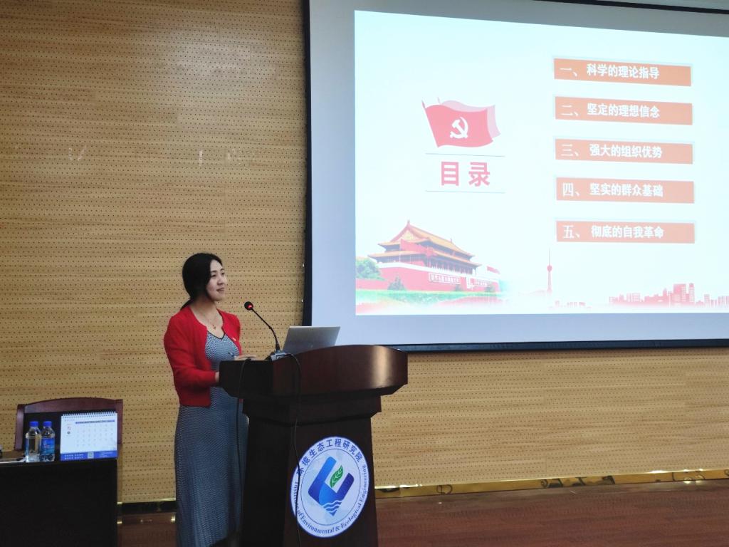 为热烈庆祝中国共产党成立100周年,扎实推进党史学习教育,3月26日下午,环境生态工程研究院直属党支部副书记曾志英在科技南楼多功能会议厅为研究院2020级全体学生上“思政第一课”。