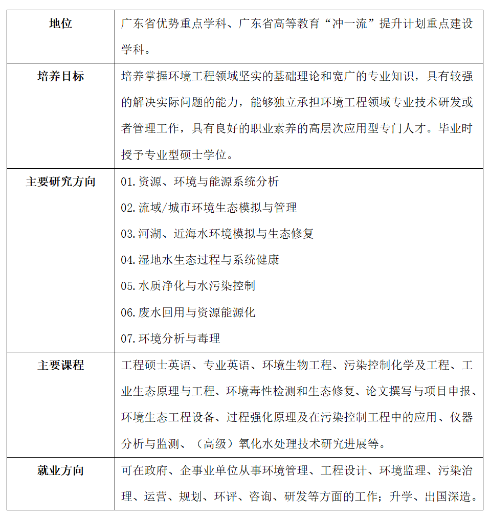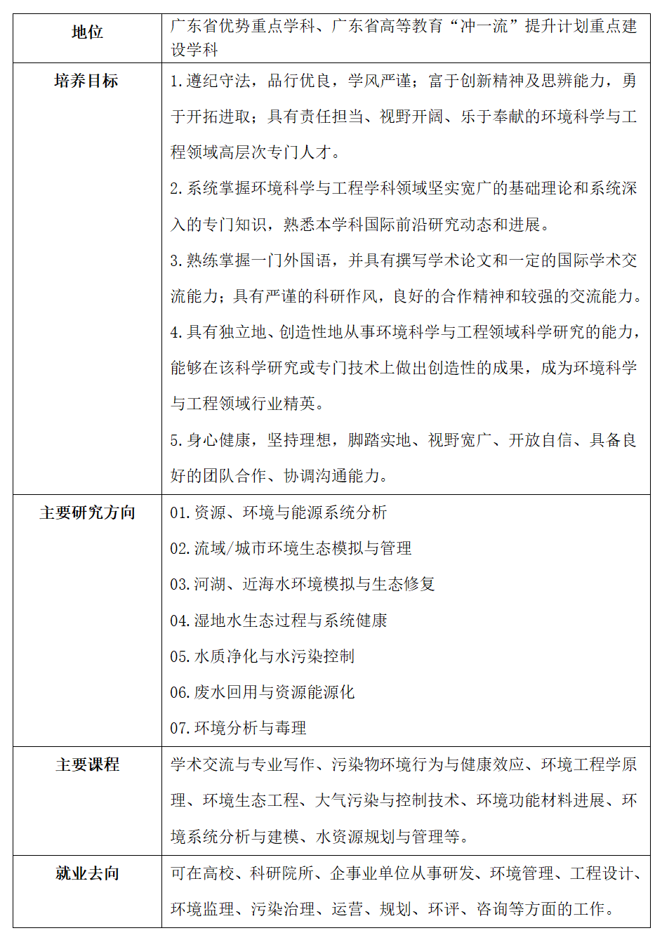 近两年硕士毕业生就业率94%,升学率20%。毕业生就业单位主要为广东省环境保护主管部门、科研院所、环境监测和环保公司,如深圳市水务(集团)有限公司、广州市城市排水有限公司、广东环科院环境科技有限公司、华润新能源风能有限公司、广州宝洁有限公司、比亚迪股份有限公司、广东美的制冷设备有限公司等。部分优秀毕业生获得国家公派留学资格,前往国际知名高校继续深造。