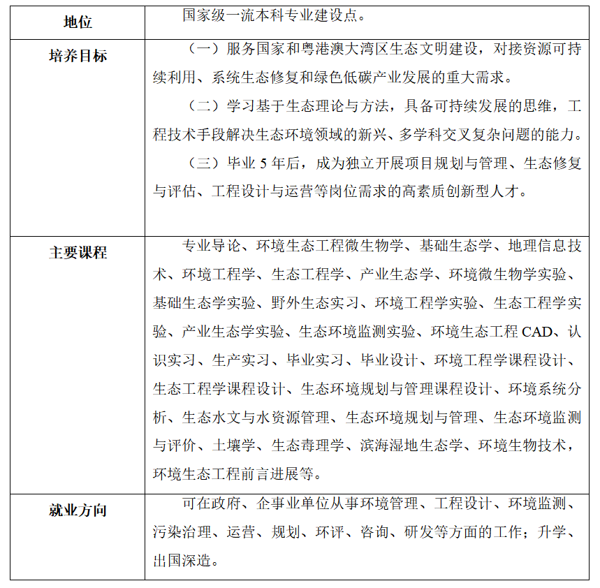 学院矢志打造粤港澳乃至全国环境生态领域的前沿科创高地和卓越人才基地,培养具有创新精神的卓越人才,提供基础理论和工程实践关键科技支撑,引领学科发展方向,服务国家生态文明建设战略和地方绿色发展需要。学院全力建设一流的环境科学与工程学科。学科现有环境科学与工程一级学科博士点和硕士点、资源与环境专业学位硕士点、环境科学与工程博士后流动站、环境生态工程(全国首批且地方院校唯一)和环境工程(全国首批)国家级一流本科专业建设点。环境科学与工程学科为广东省优势重点学科、广东省高等教育“冲一流、补短板、强特色”提升计划重点建设学科。ESI环境/生态学全球排名从2019年首次进入前1%上升至2024年4月0.22%,工程学全球排名前0.04%,软科世界一流学科排名环境科学与工程全球前50;泰晤士高等教育中国学科评级A类;校友会2023中国大学一流专业排名环境生态工程专业蝉联全国第一。