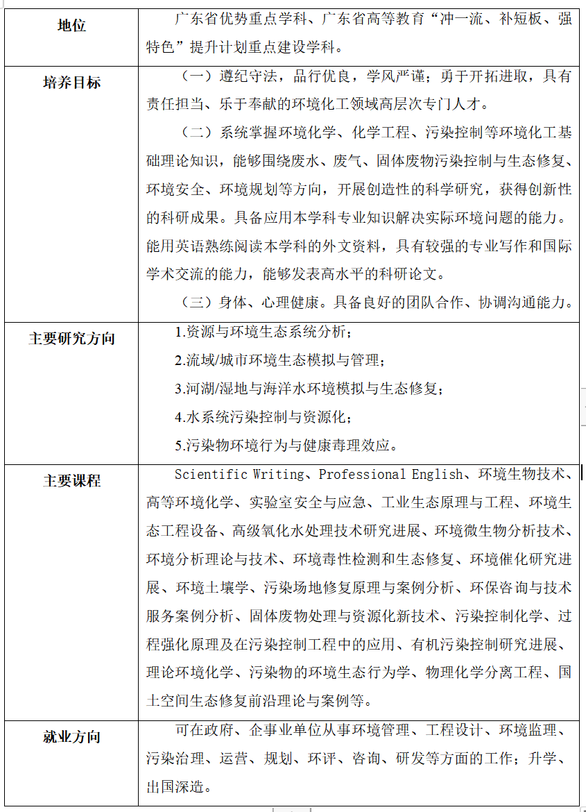 近两年硕士毕业生就业率96%,升学率8%。毕业生就业单位主要为广东省生态环境厅主管部门、科研院所、环境监测和环保公司等。部分优秀毕业生前往知名高校继续深造,如中国科学技术大学、北京航空航天大学等。