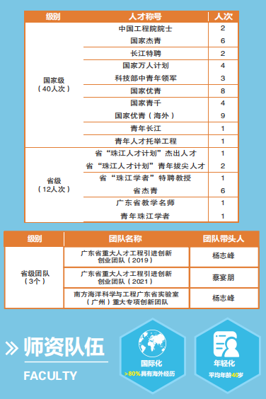 学院汇聚院士、国家杰青、长江学者特聘教授、国家万人领军等在内的国家级高层次人才共计40人次、省级人才共计12人次,牵头获批省级创新团队3个;承担国家自然科学基金委基础科学中心项目任务、重大科研仪器研制项目、重点项目、重大项目课题以及国家重点研发计划重点专项项目和中国工程院重大咨询项目等100余项;主持广东省高等学校基础研究卓越中心项目、广东省重大人才工程引进创新创业团队项目、广东省重点研发项目、广东省海洋六大产业专项项目等200余项;在Nature子刊、Cell子刊、PNAS等高水平期刊发表论文1300余篇;获国家及省部级奖项23项。